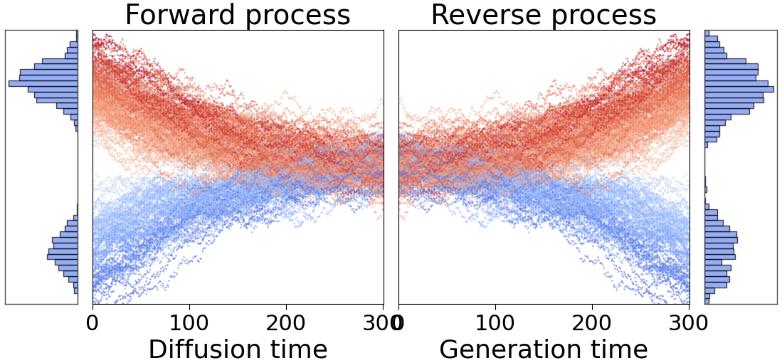 Two original Gaussian distributions are progressively transformed into normal distribution. A denoising network then reconstructs the original distributions.