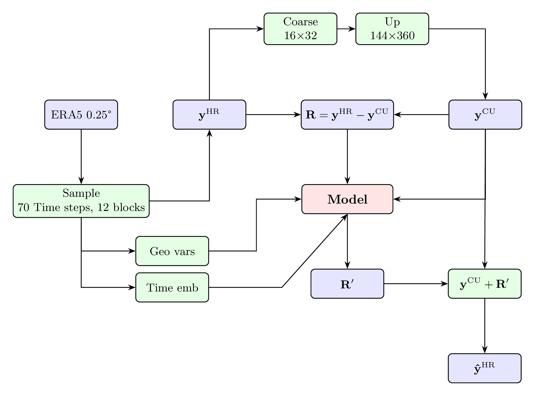 Residual: Fine-scale information \(\mathbf{R} = \mathbf{y}^{\mathrm{HR}} - \mathbf{y}^{\mathrm{CU}}\) serves as training target